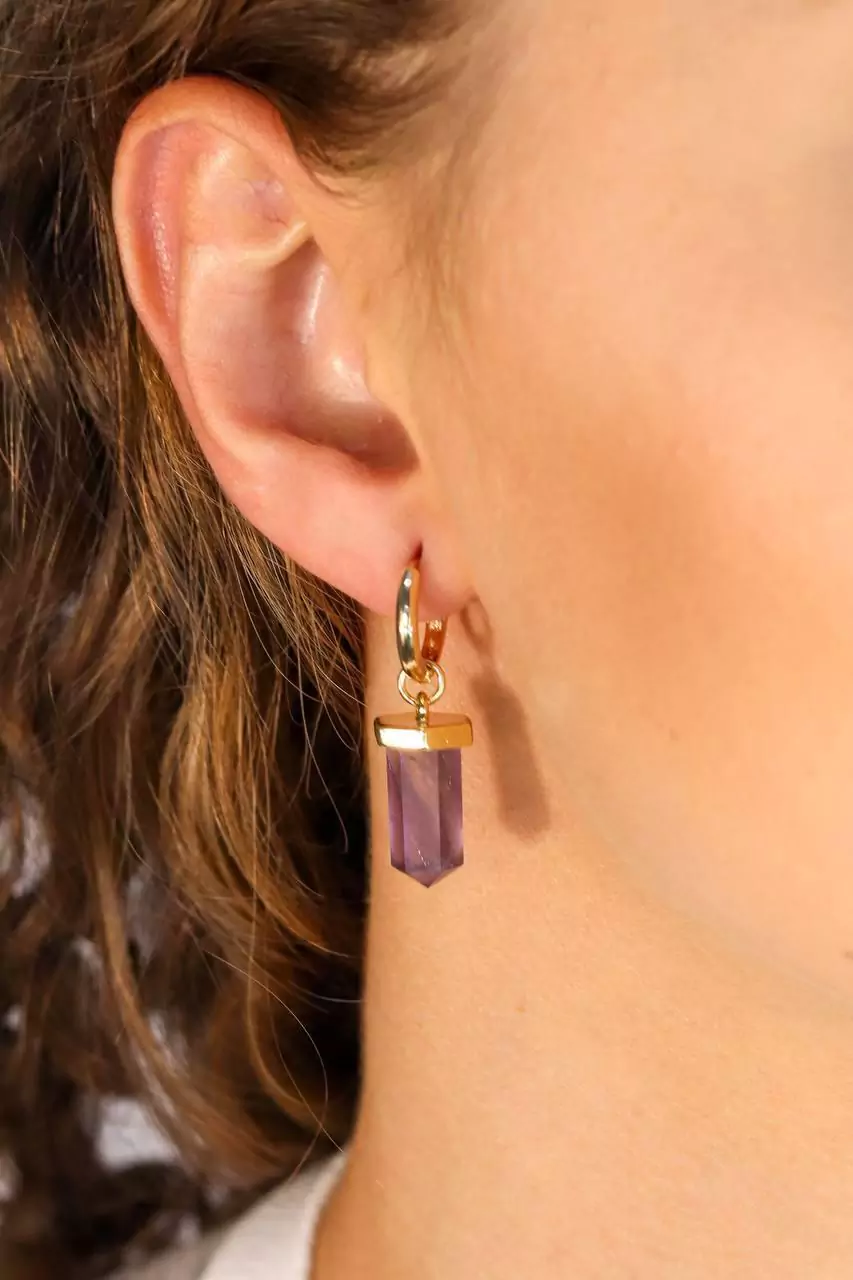 O brinco possui uma argolinha elegante com banho de ouro 18k e um pingente em ametista lapidada em formato de ponta, que valoriza a pedra natural e traz um toque moderno e sofisticado ao visual. Leve e versátil, ele pode ser usado tanto em produções mais básicas quanto em combinações com outros acessórios, criando um mix cheio de personalidade.