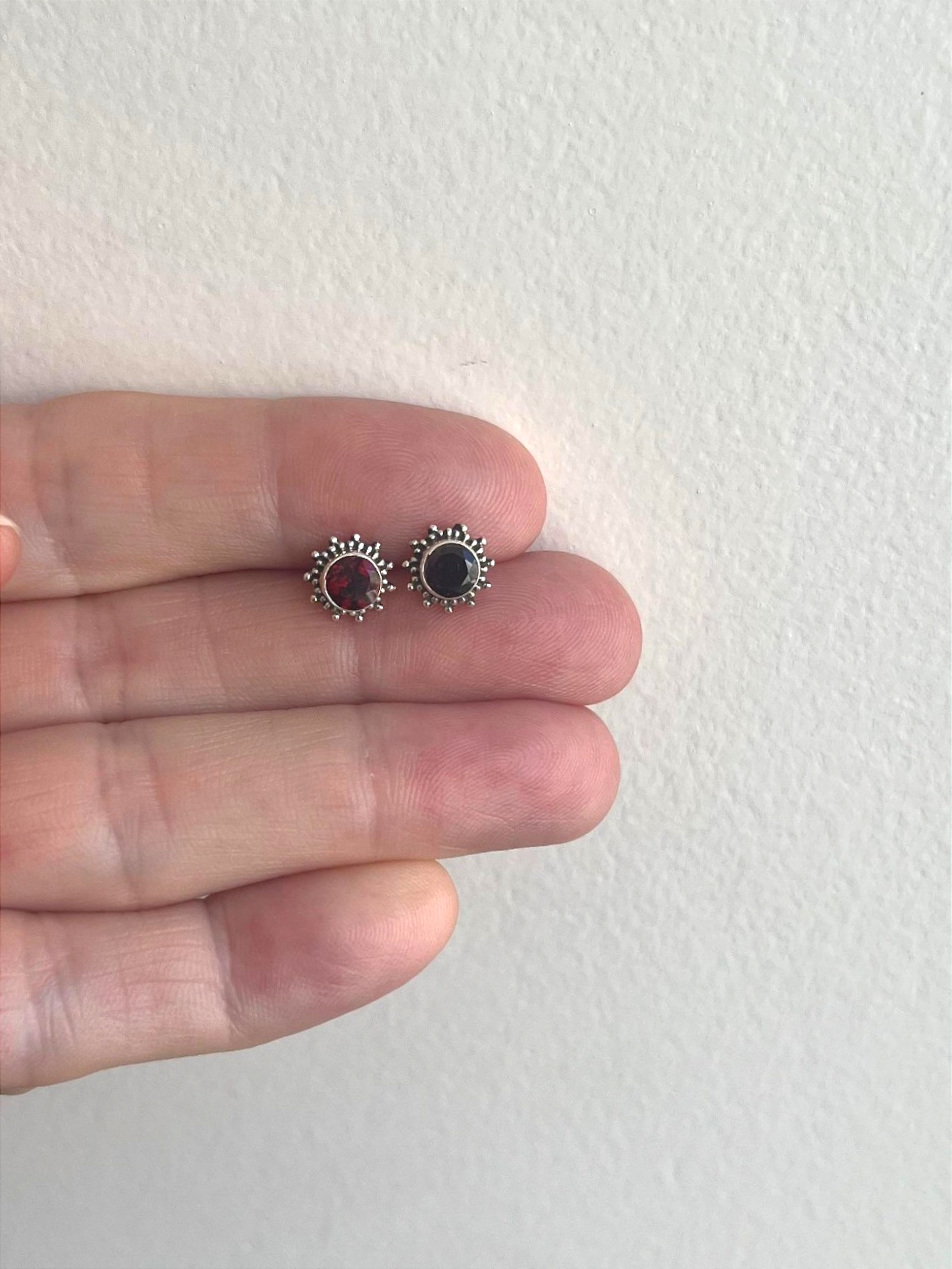 Em prata 925 e com granada natural facetada, este brinco traz um brilho profundo e marcante em tons de vermelho intenso, iluminando o rosto com elegância e personalidade. O design arredondado com detalhes em relevo cria um efeito sofisticado e atemporal, perfeito para quem ama joias pequenas, confortáveis e cheias de presença.