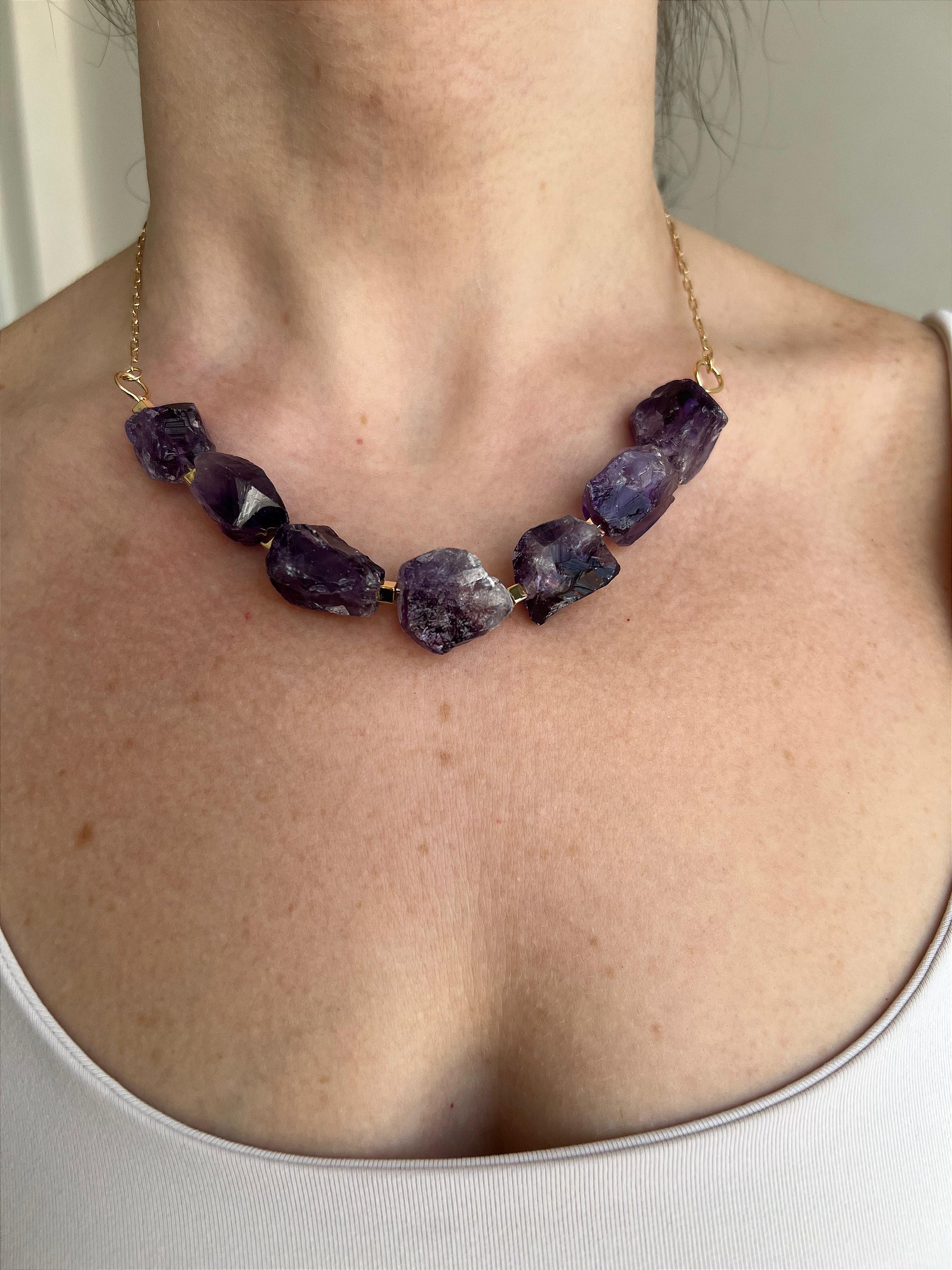 Esse colar é composto por pedras naturais de ametista bruta, preservando sua forma original e energia pura da natureza. Cada cristal carrega suas próprias nuances de cor e textura, tornando cada peça exclusiva.