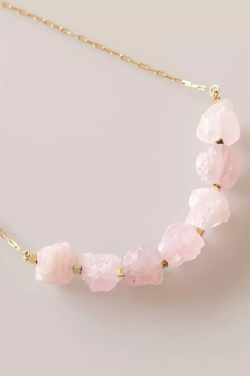 Este colar é composto por pedras naturais de quartzo rosa bruto, preservando sua forma original e a energia pura da natureza. Cada cristal carrega suas próprias nuances de cor e textura, tornando cada peça exclusiva.