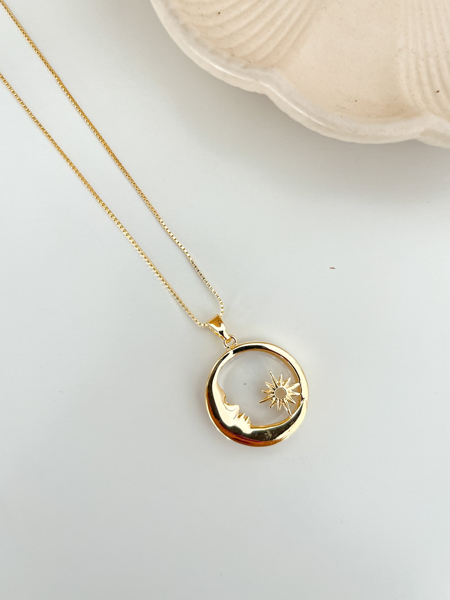 Delicado e cheio de significado, este colar une a simbologia da lua à energia pura do Quartzo Cristal. O pingente redondo em banho de ouro 18k traz o desenho da lua em relevo, representando intuição, equilíbrio emocional e renovação, enquanto o Quartzo Cristal ao centro ilumina a peça com seu brilho suave e translúcido.