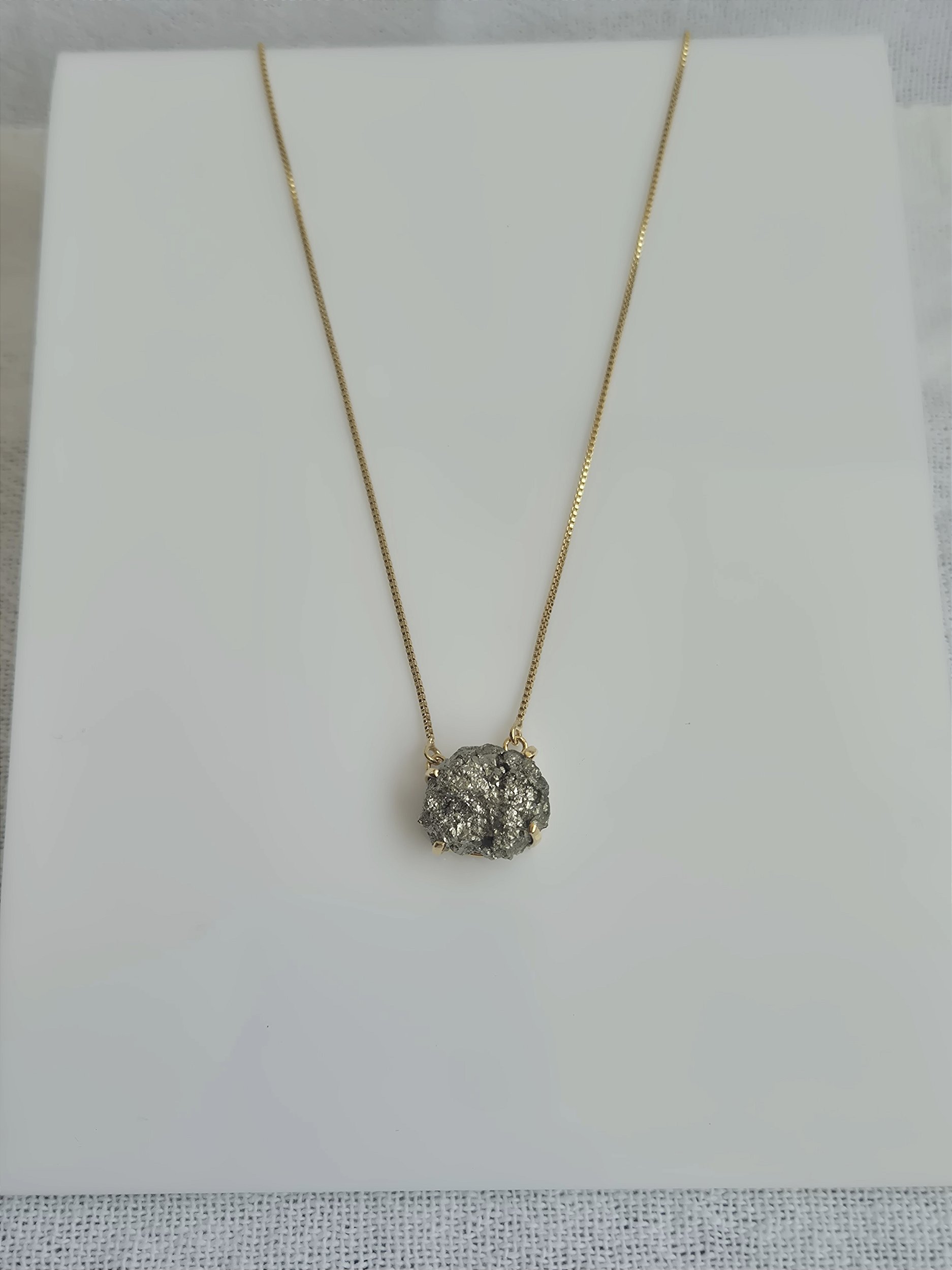 Um colar que brilha como prosperidade. A pirita — conhecida como a pedra da abundância e da atração financeira — é o ponto central dessa semijoia poderosa. Seu tom dourado se conecta ao ouro 18k do banho, criando uma harmonia visual luxuosa, forte e cheia de presença.